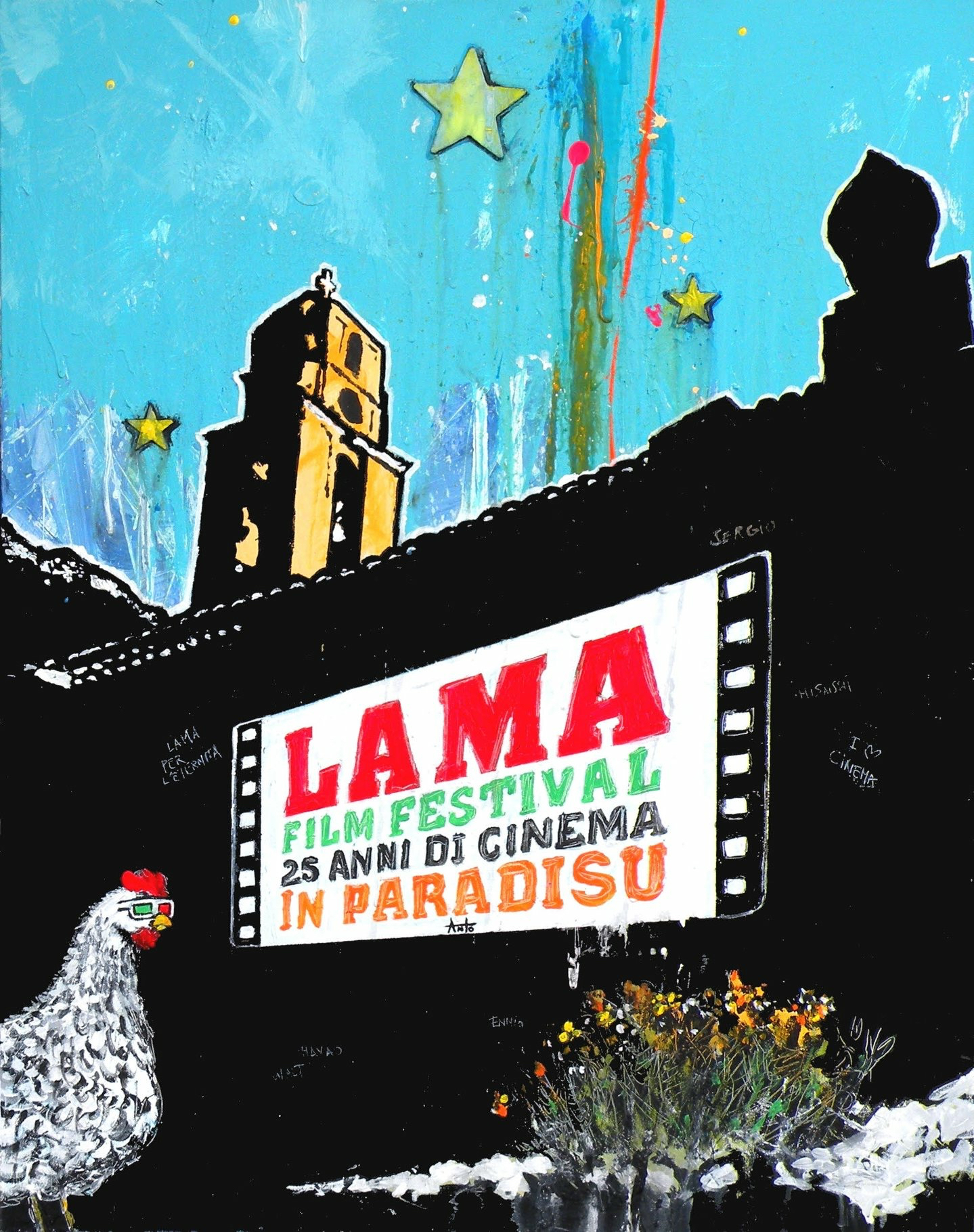 L’affiche de la vingt-cinquième édition, née sous les pinceaux inspirés de l’artiste balanin Antò, rappelle merveilleusement ce qui fait la spécificité du festival : magie des projections sous les étoiles, dans ce paradis qu’est le patrimoine du village, qui fait corps avec le festival dans son monument rassembleur, l’église dont le mur accueille les projections des kinos. Enfin le rappel du thème fondateur, la ruralité, symbolisé par la poule, si longtemps présente sur les précédentes affiches.