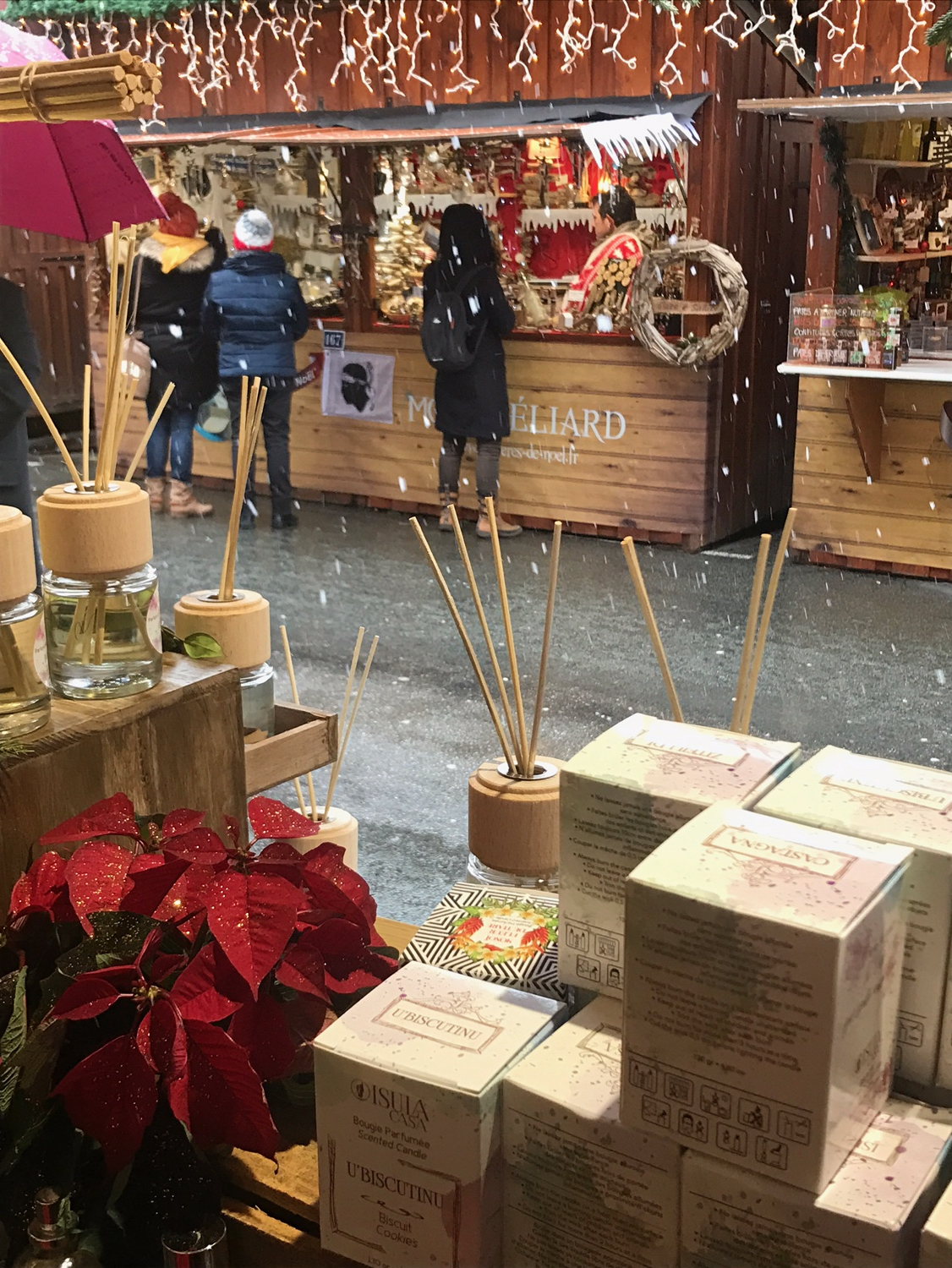 Le marché de Noël de Montbéliard est connu comme un très grand évènement dans la région Bourgogne Franche Comte. Il est surtout connu pour ses lumières qui donnent un côté magique et féerique à la ville. Les produits mis en avant sur le Marché sont sélectionnés par la mairie et les élus. Leur souhait est de mettre en avant l’artisanat et la gastronomie provenant de la France entière. Ici pas de made in China, que des produits des régions et du made in local. Après l’Autriche en 2016, Montbéliard accueille la Corse, invité d’honneur de la 31e édition des Lumières de Noël. Installé en plein cœur du marché de Noël, le village corse accueille une quinzaine d’artisans qui représentent le meilleur de l’artisanat d’art et de la gastronomie de l’ile de beauté.
