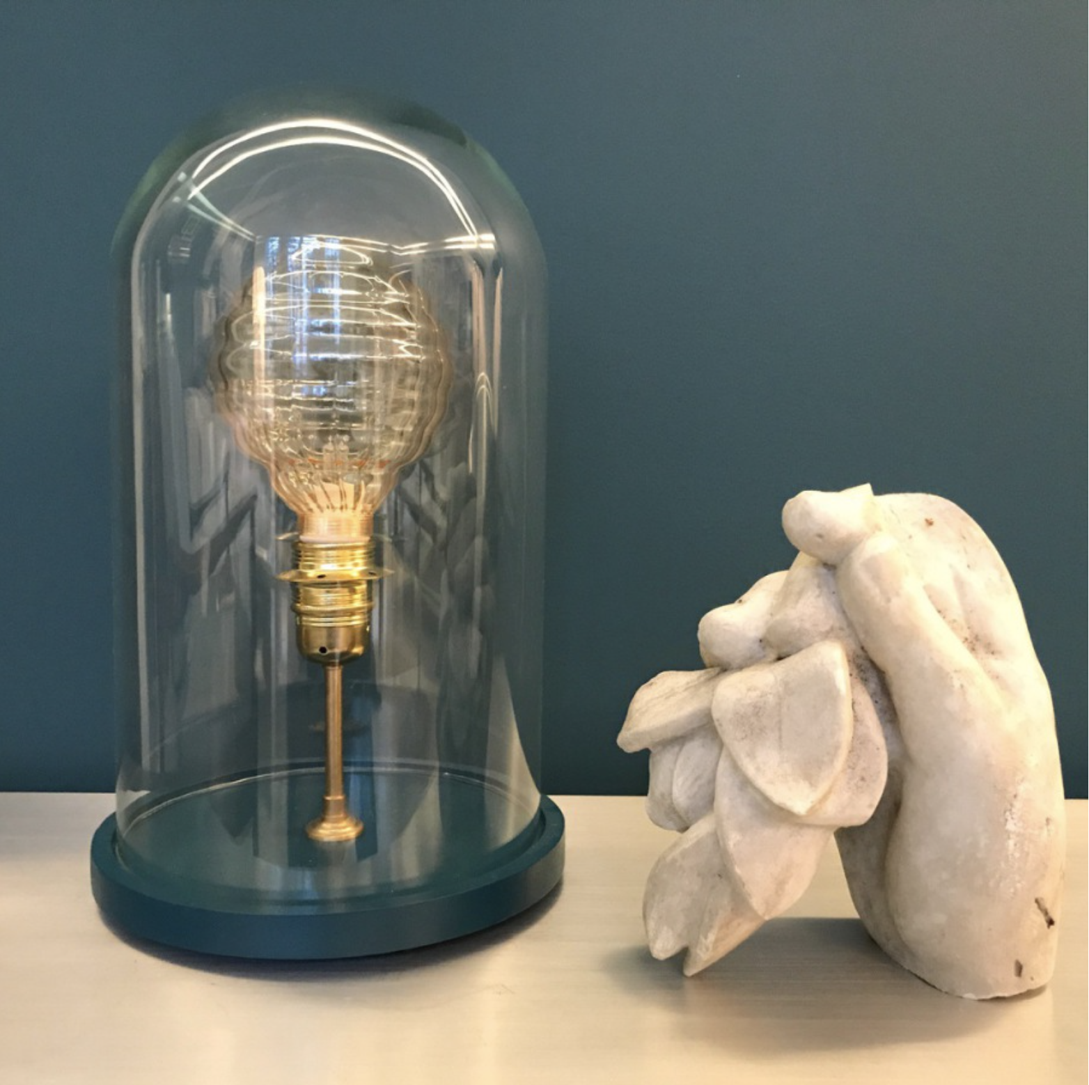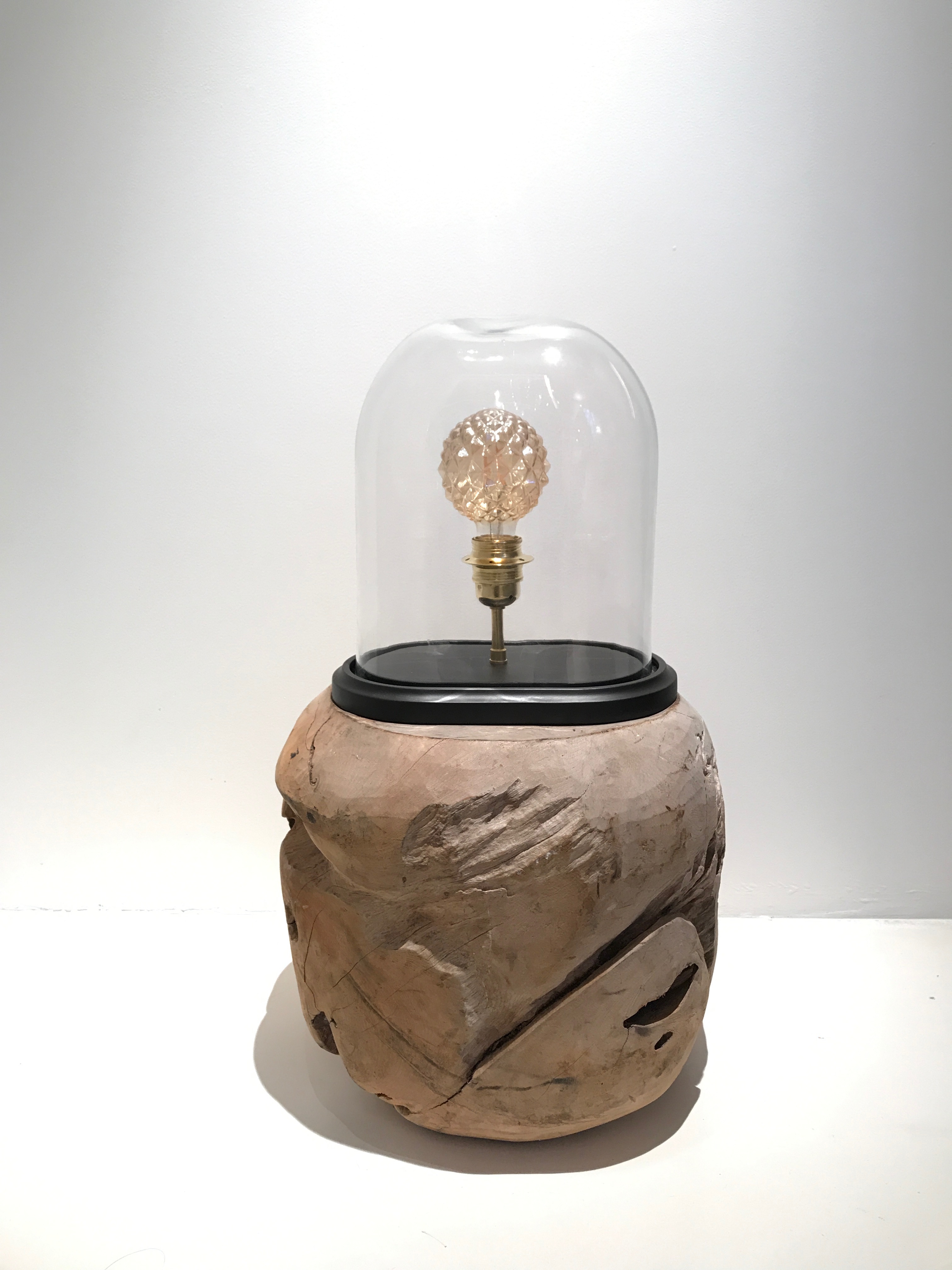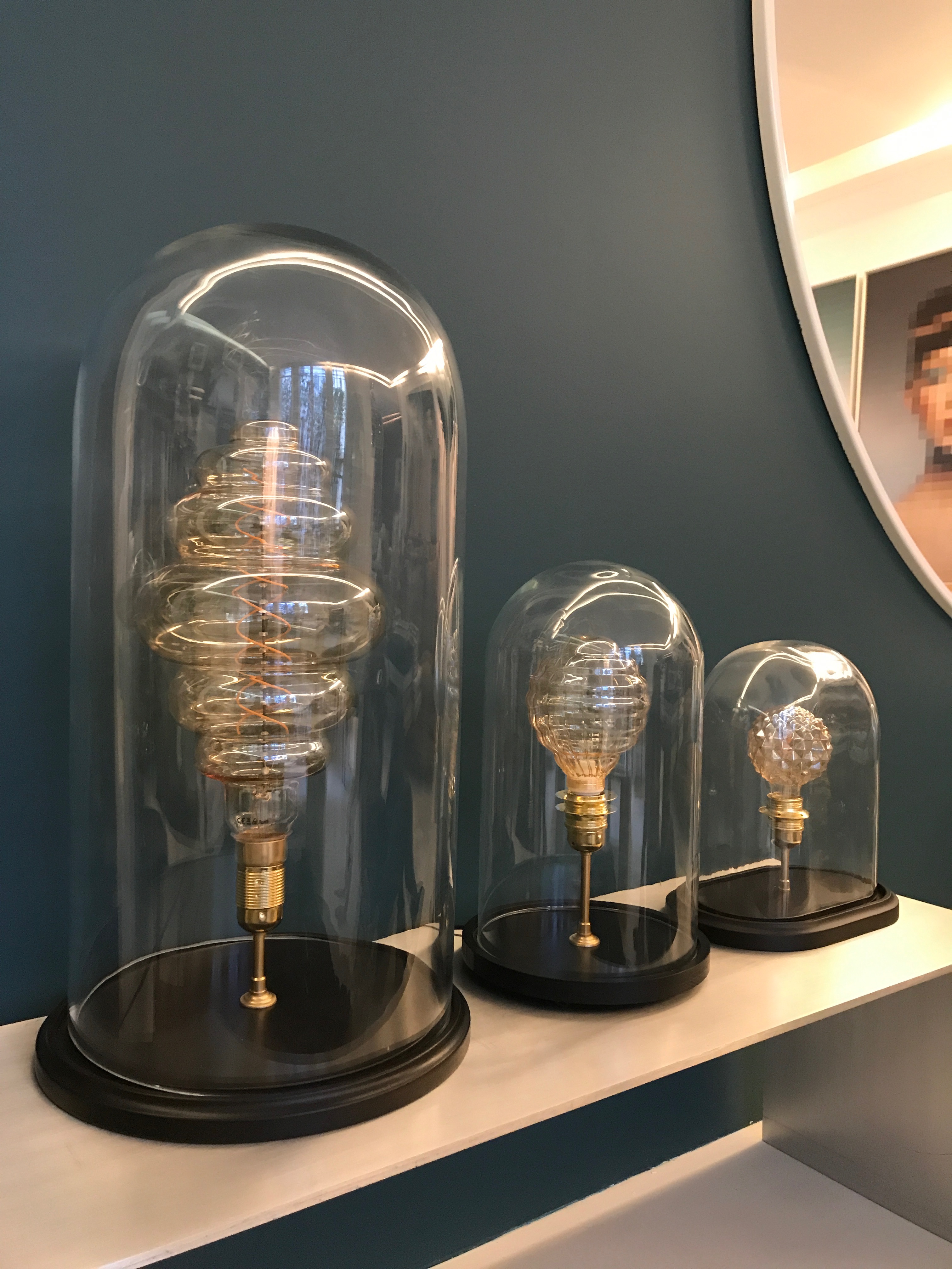Je fabrique mes lampes moi-même dans mon atelier à Paris. Les cloches sont en verre soufflé Italien, et les socles en bois. Les socles sont peints en divers coloris, bleu canard, vert profond, taupe, noir, bleu klein, gris clair, bordeaux.