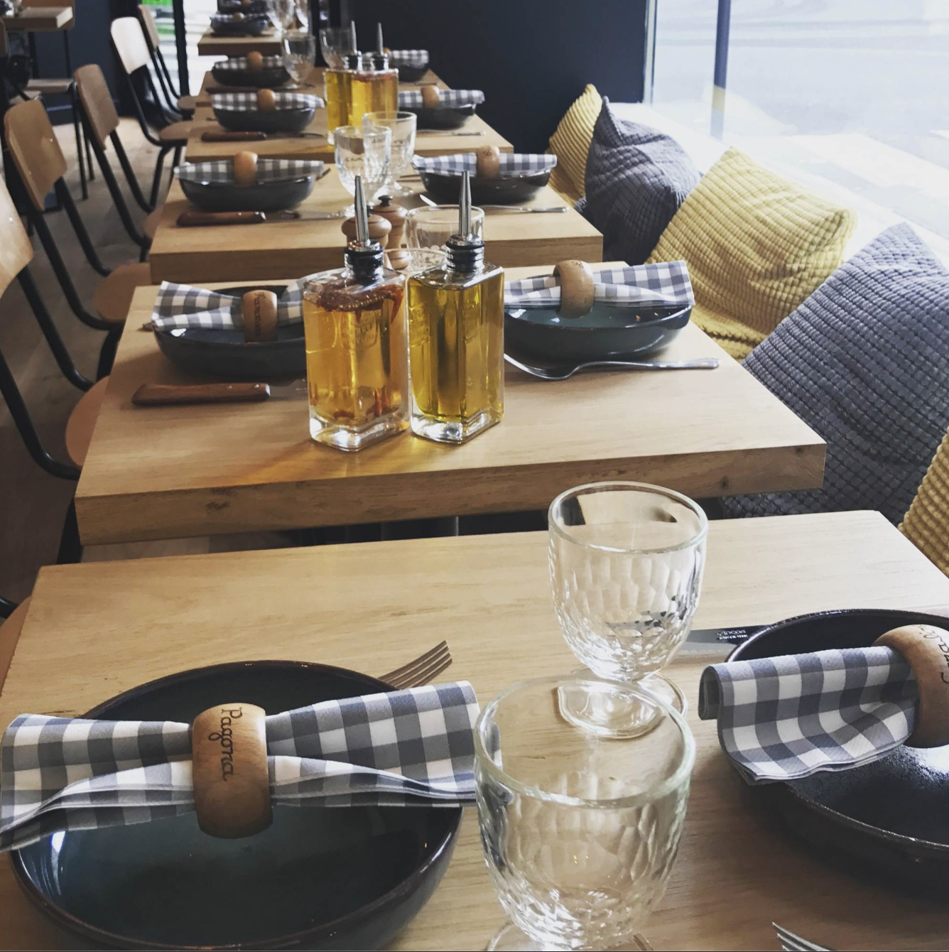 Elle aussi est pointilleuse mais surtout éclectique ! Lampes danoises, coussins suédois, planchettes à pince pour les menus en provenance du Minnesota, tabliers marseillais, azuléjos belges et partenaires parisiens. C’est Jade Juste et Olga Nousse qui ont porté le projet architectural de Pinzunti. Leur agence Just’n’Nousse assume la volonté de provoquer une émotion esthétique, de la pertinence, de la sobriété et de la qualité pour une ambiance authentique ! Spéciale dédicace à l’artiste, Mathieu Chanpel, qui a su donner une véritable identité au restaurant avec sa création picturale d’un sanglier courant dans le maquis corse.