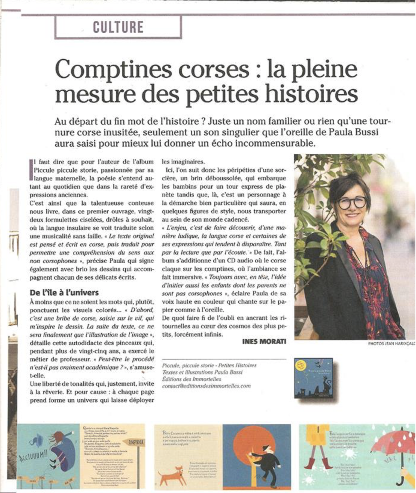 Paula Bussi a écrit 22 petites comptines en langues corse et française qui emmènent les enfants dans un univers poétique, touchant et souvent amusant, tout en leur faisant découvrir de belles expressions corses parfois un peu oubliées. À la fois ludique et pédagogique, cet ouvrage s’accompagne d’un CD audio afin de permettre aux enfants, comme aux parents, de se familiariser avec la belle musicalité de la langue corse. Explication sur Pari(s) sur la Corse.